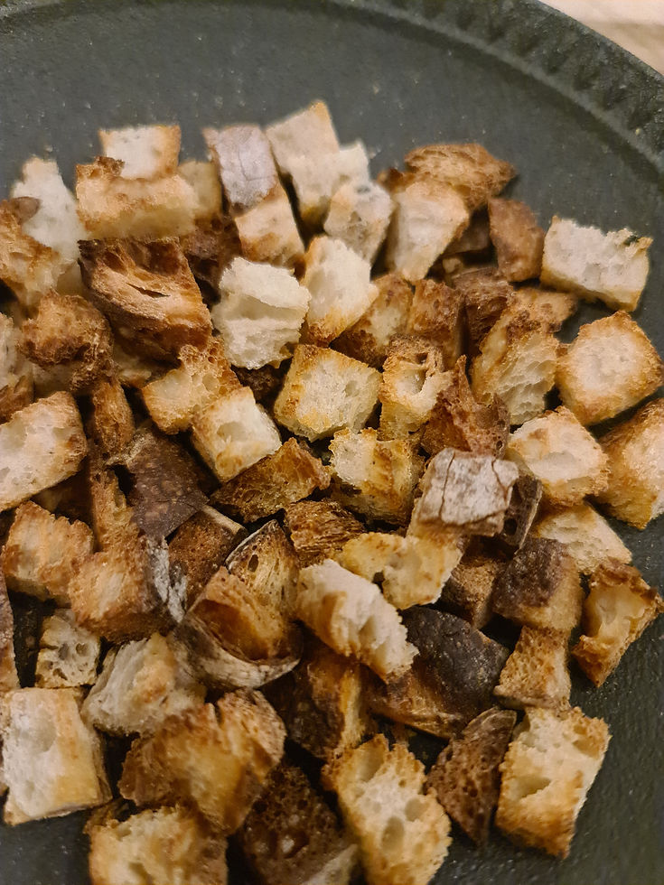 Fiz assim: 5 Fatias de pães de longa fermentação cortadas em cubos de tamanhos uniformes. Espalhei na bandeja perfurada no meu #NC4 da @nathionalcook e levei ao forno a 230° por 5/10 minutos. Retirei e deixei esfriar para ficar crocante.